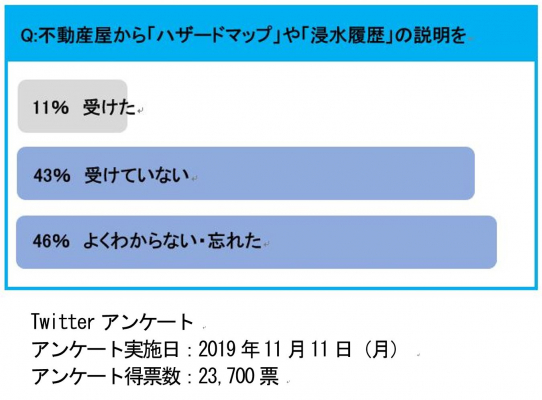 このような状況を受け、業界初の個人向け総合不動産コンサルティング・ホームインスペクション(住宅診断)を行う “不動産の達人 株式会社さくら事務所”(東京都渋谷区/社長:大西倫加)では、住まい選びの際における不動産仲介事業者からのハザードマップ・浸水履歴に関する情報提供の実態について独自調査(Twitterアンケート 実施日:2019年11月11日 得票数:23,700票)を実施したところ、「説明を受けた11%」「受けていない43%」「よくわからない・忘れた46%」