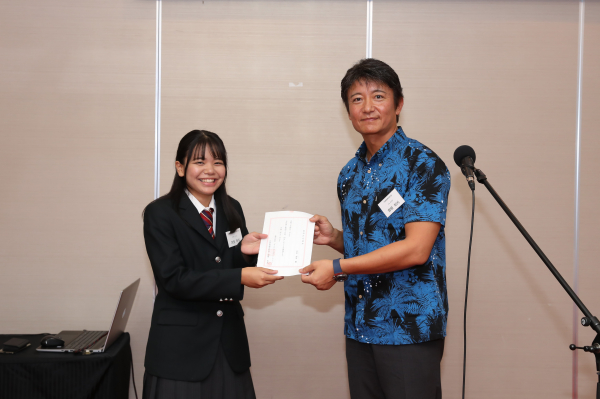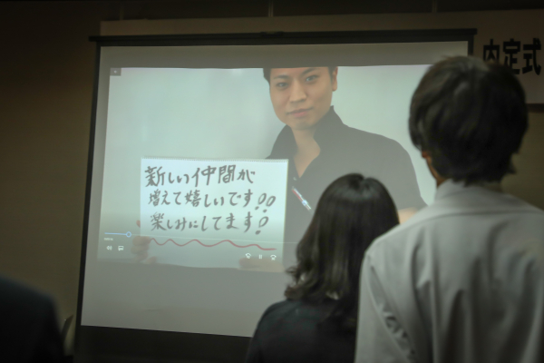 内定式で証書授与などを行った後、同会場で行われた懇親会では、沖縄県出身者の社員が登場する動画などを上映しました。テーマは「成長」。高校時代の写真を用いて、社員の学生から入社後の変化を伝えたことで、内定者の将来を想像し涙ぐむ保護者の方もいらっしゃいました。事前に行った入社説明も含めて2時間半の会を終えた内定者やご家族からは、「会社の雰囲気が分かり、入社後の目標が決まった」「家族も安心してくれてうれしかった」「内定者や保護者への心遣いを感じた。至れり尽くせりのおもてなしに感動した」といったお声をいただきました。