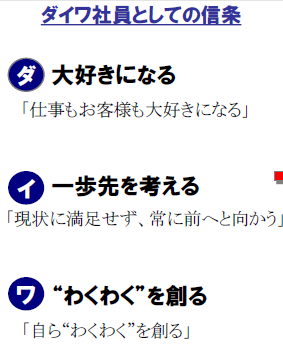 当社には基本理念の中の行動指針の一つとして、「ダイワ社員としての信条 大好きになる/一歩先を考える/?わくわく?を創る」があり、社員は基本理念に基づき業務を行っています。