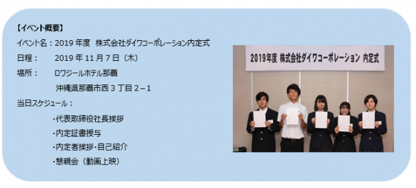 当社は2017年度入社社員から沖縄県での高卒採用をスタートしており、現在までに13名の沖縄県出身者が入社し活躍中です。内定式に招待した生徒5名を含めると来年度の沖縄県出身者は18名となり、正社員の約10%を占めます。これは、当社の基本理念の中のひとつ「ダイワ社員としての信条」を大切に、採用活動を行っている結果ともいえます。