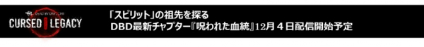 Dead by Daylightの最新チャプターが『呪われた血統』に決定したことをご案内いたします。このチャプターはPlayStation4ならびにNintendo Switch専用ソフトとして好評発売中の『Dead by Daylight公式日本版』でゲーム内もしくはストアから追加コンテンツとして購入することでお楽しみいただけます。以下はBehaviour Interactiveによる公式アナウンス情報の和訳となります。