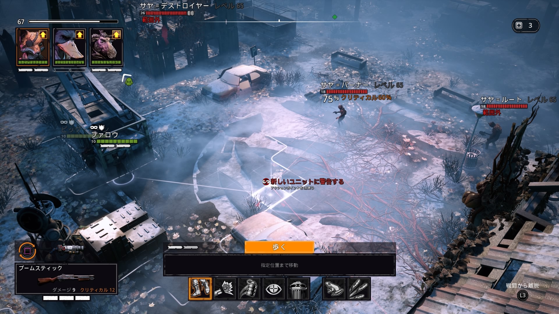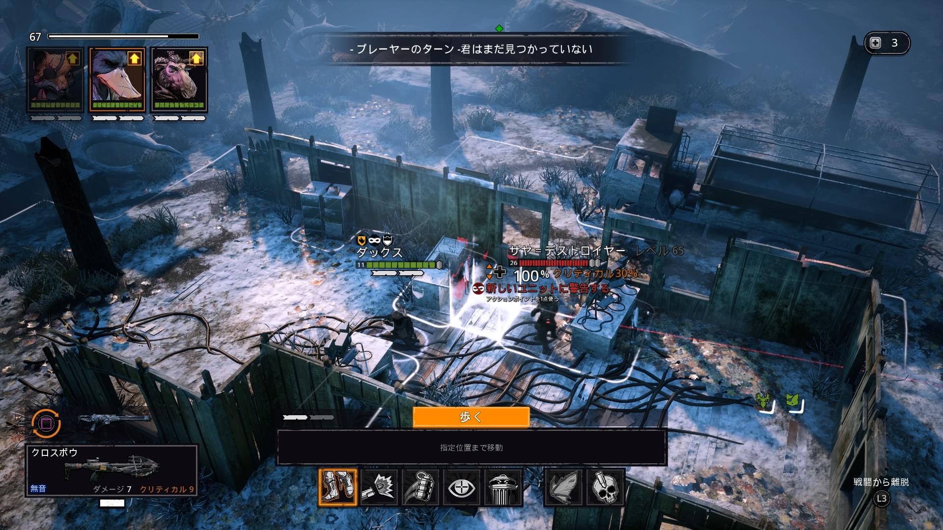 ターン制バトルを謳う本作は、ゲームの進行全体ではリアルタイムのステルス行動が戦況に大きく影響を与え、常に敵の裏をかく慎重な戦術計画が重要となります。戦闘に発展する前に敵ユニットの配置を見極め2~3歩先を読み、命中率の高い位置取りと攻撃手段をよく考えてから先手を取る事が最重要となります。
