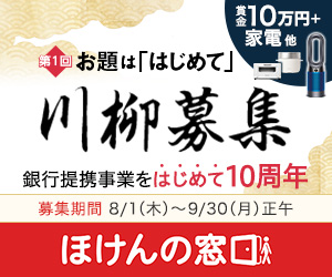 ほけんの窓口グループ株式会社(本社:東京都千代田区、代表取締役会長兼社長:窪田泰彦)は、2019年8月1日から9月30日まで、全国の地方銀行と提携事業を始めて10周年となることを記念して【第1回 お題は「はじめて」ほけんの窓口川柳】を実施し、受賞作品を2019年11月25日に発表しました。当社が乗合保険代理店として銀行提携事業を「初めて」、「始めて」から10周年を迎えたことにちなみ、本川柳募集のテーマは「はじめて」といたしました。