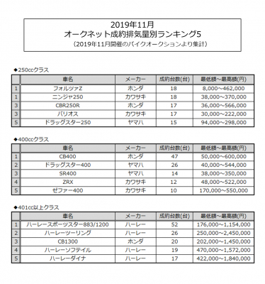 情報流通支援サービスの株式会社オークネット(本社:東京都港区/社長:藤崎清孝)は、2019年11月度のオークネットバイクオークションにおける成約台数を集計し、排気量別ランキングベスト5をまとめました。