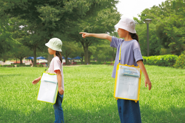 小学校低学年を中心に課外学習や生活科・理科・体育などで学習用のクリップボードがよく使われています。今回発売する「かんさつ学習ボード」は、子供の使い方や野外での使用に適した工夫を凝らし、本体の素材に発泡PPシートを使用することにより、軽量化と高い耐久・耐水性を実現しました。また、安全性にも配慮し、首や肩から下げて使用するためのストラップは、首に大きな負荷がかかると外れる仕組みにするなど、子どもにとっては使いやすく、先生や親も安心して子どもに使用させることができます。本体裏に取り出しやすく工夫されたファスナー付きペンケースとプリントポケットを装備しているので、筆記具やプリントをまとめて持ち歩けます。