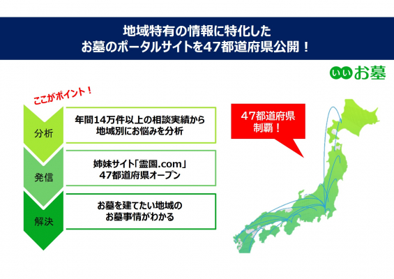 当社が運営する日本最大級のお墓の情報サイト「いいお墓」は、お電話やメールにて、年間14万件以上のご相談を承っています。さまざまなお悩み事をかかえるお客様がいらっしゃいますが、「お墓事情」は、地域によって大きく異なります。そこで創業以来35年間、終活領域で様々なサービスを提供してきた当社では、地域性に特化したお墓の情報をご提供することで、今まで以上にお客様のご要望に寄り添ったお墓探しをサポートしたいと考えました。