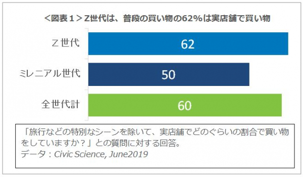 オンラインショッピングは、依然として実店舗の成長を上回っているものの、依然としてほとんどのカテゴリーで実店舗が売上の大半を占めています。The NPD Groupのアパレル業界アナリストのMaria Rugoloは、「Z世代は、一般的な商品全般に渡って店頭で購買する傾向を持っている(図表1)」と述べています。 これは、クレジットカードの所有率が低いことが理由の1つと考えられます。当面、ブランドと小売業者は、Z世代獲得のために店舗戦略に重点を置く必要があると言えます。