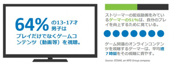 13-17歳の米国少年の3分の2近くは、ビデオゲームをプレイすることに加えて、ビデオサービスであるTwitchやYouTubeなどのコンテンツを視聴するようになりました(EEDAR’s 2018/2019 Consumer Segmentation reportより)。Dr. Heather Nofzigerは「その一方で、この年齢層の少女たちは、少年よりもゲームをする可能性が低いとされているが、少女たちもゲーマー中のかなりの割合を占めている」と述べています。また、ゲームコンテンツの平均視聴時間は、週7時間であることが、この調査で明らかになりました。The NPD Groupのビデオゲーム業界アナリストのMat Piscatellaは、「ゲーマーたちはお気に入りのストリーマー(自分のゲーム体験を放送するゲーマーたち)を見ています。 ゲーマーはこれらの動画を見て、自分たちのプレイの参考にしています」。 実際、ストリーマーを視聴するゲーマーの51%が、これらのビデオを視聴してゲームプレイを改善しているとEEDARの研究報告が報じています。
