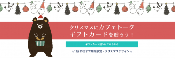 世界中の講師と生徒をつなぐオンライン習い事サイト「カフェトーク( https://cafetalk.com/ )」を運営する株式会社スモールブリッジ(本社:東京都渋谷区、代表取締役:橋爪 小太郎)は、2019年12月6日カフェトークギフトカードの限定クリスマスデザインの販売を開始いたしました。