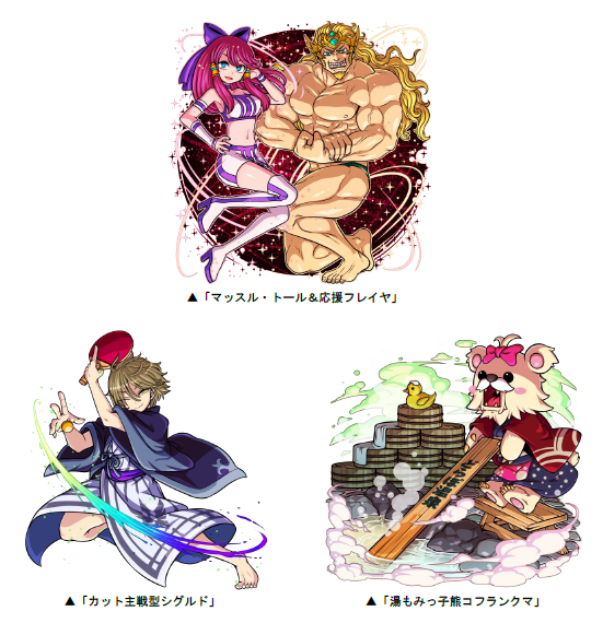 本ダンジョンで期間限定のミッションを達成すると、新たに登場するSS+レア「マッスル・トール&応援フレイヤ」やDRAレア「湯もみっ子熊コフランクマ」「カット主戦型シグルド」をゲットできます。