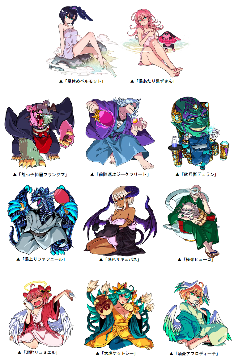 さらに、道中には「足休めベルモット」「湯あたり黒ずきん」「前陣速攻ジークフリート」「湯上りファフニール」「飲兵衛デュラン」「極楽ヒューゴ」「大虎ケットシー」「酒色サキュバス」「泥酔リュミエル」「酒豪アフロディーテ」などが登場します。