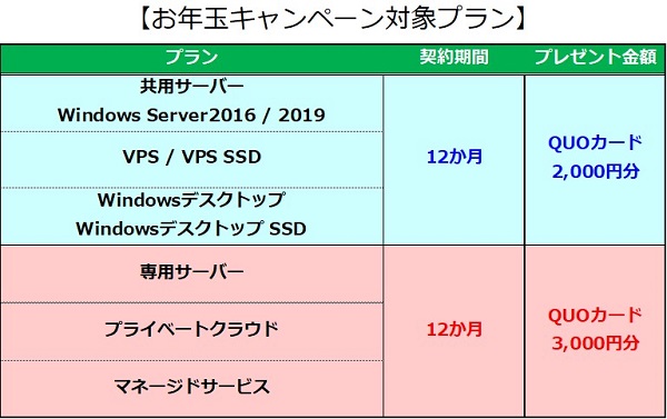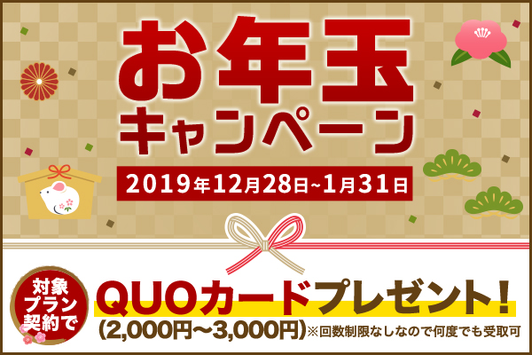 今回のお年玉キャンペーンでは、弊社サーバーの対象プランにご契約いただいたお客様全員へQUOカードをプレゼントいたします。