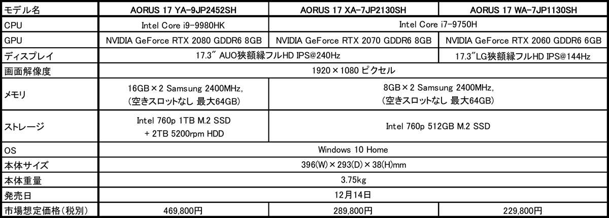 AORUS 17シリーズの主な仕様と市場想定価格(税別)は以下のとおりです。
