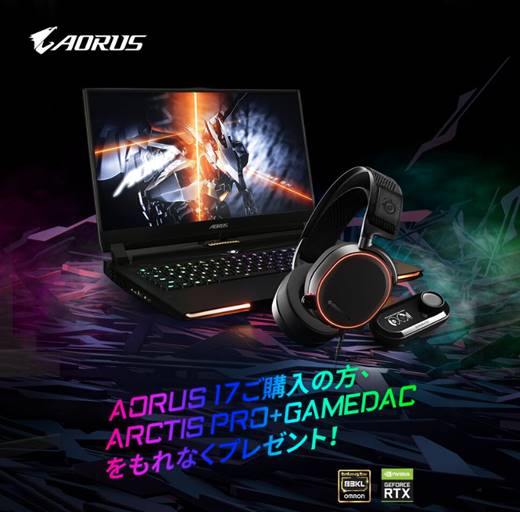 なお、GIGABYTEでは、2019年12月14日~2020年1月13日の期間にAORUS 17シリーズを購入して、Amazon.co.jp、価格.com、ショッピングサイトなどに100文字以上のレビューを投稿してくださったユーザーを対象に、SteelSeriesのARCTIS PRO + GAMEDACをもれなくプレゼントするレビューキャンペーンを実施いたします。キャンペーン登録期間は、2019年12月14日~2020年1月20日です。応募方法などの詳細につきましては、下記キャンペーンページをご参照ください。