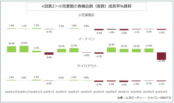 月次の外食業態の食機会数(客数)の成長率を見ると(図表1)、消費増税後の2019年10月は、イートインが7.6%減、テイクアウト・出前が6.1%増でした。イートイン・テイクアウト・出前合計では4.4%減となりました。台風19号の影響で1-2日程度閉店した店も多いことも全体の客数に影響しましたが、テイクアウト・出前は軽減税率の影響で増加したと言えるでしょう。売上高では、テイクアウト・出前は12.5%増加、イートインは5.4%減、合計2.9%減でした。