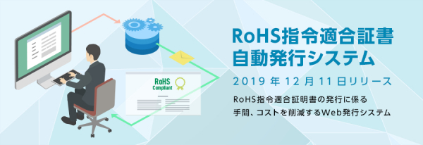株式会社パイプドビッツ(東京都港区、代表取締役社長CEO 林哲也、以下「パイプドビッツ」)は、RoHS指令の対象品目を取り扱うメーカー向けに「RoHS指令適合証明書自動発行システム」を開発し、本日2019年12月11日より提供開始しました。本システムにより、RoHS指令適合証明書(以下「証明書」)の発行申請をWebで受け付け、証明書を即時発行してメーカー担当者のオペレーション業務を軽減します。なお、本システムはパイプドビッツの情報資産プラットフォーム「スパイラル(R)」を基盤に構築されています。