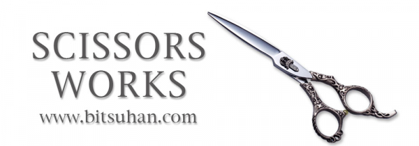 「彫刻シザー6.25インチ」・・・ハンドル部分に彫刻デザインをあしらったカットシザーです。剣士の剣をモチーフにした立体ネジもインパクト抜群。毛がほどよく逃げる笹刃タイプで、スライドカット・チョップカットに最適です。