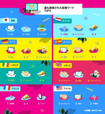 今回オロでは、そんな投資方法に着目し、期間中(2016年9月~2019年9月)において、検索エンジンでの平均検索ボリュームが高かった投資に関するワードを『SEMrush』を用いて調査し、日本を含む世界8カ国の最も検索された投資ワードランキングTOP3を出しました。