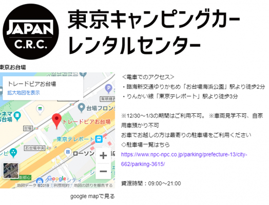 キャンピングカー株式会社(本社:東京都千代田区、代表取締役社長:頼定 誠)が運営する「ジャパンキャンピングカーレンタルセンター(以下Japan C.R.C.)」は、2019年12月より「東京キャンピングカーレンタルセンター(東京C.R.C.)」https://japan-crc.com/tokyoの新たな拠点として、東京でも屈指の観光スポットが集う街『お台場営業所』を新たに開設したことをお知らせいたします。