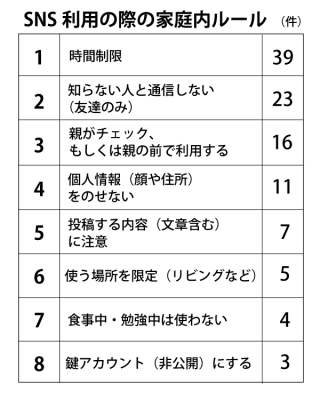続いて、「SNSを利用するときのルールを設けていますか?」という設問に対しては、「ある」という回答は45%、「ない」が55%となり、半数の過程ではルールがない状態でした。利用ルールで1番多いのは時間制限。投稿内容についてもルールがある家庭もあり、さまざまという結果でした。