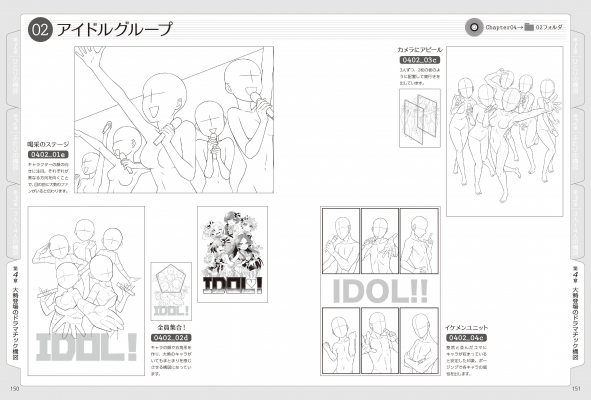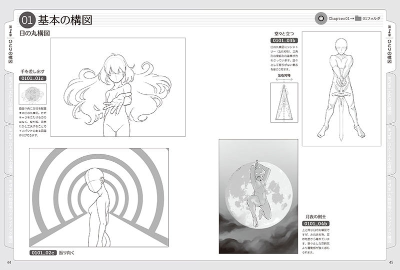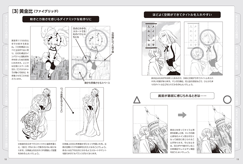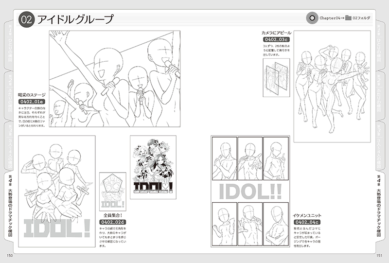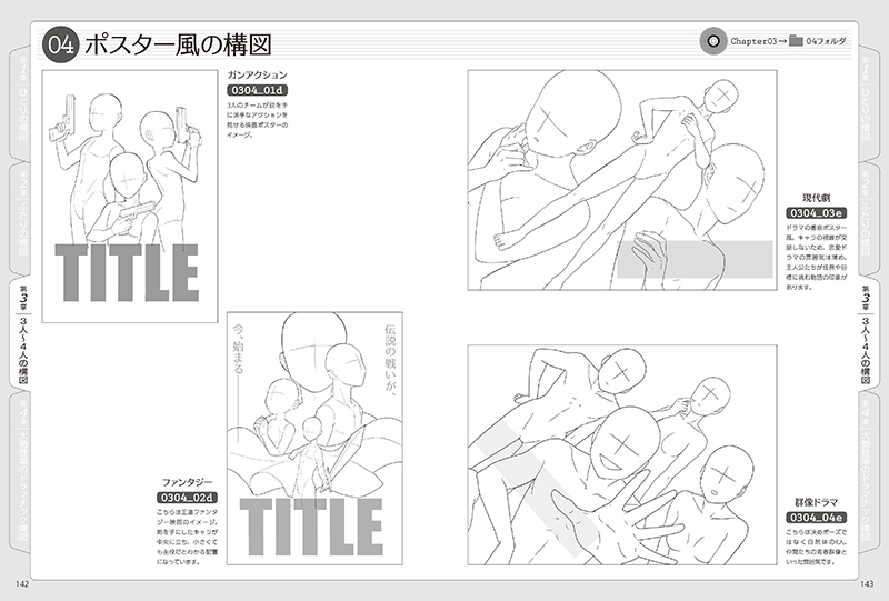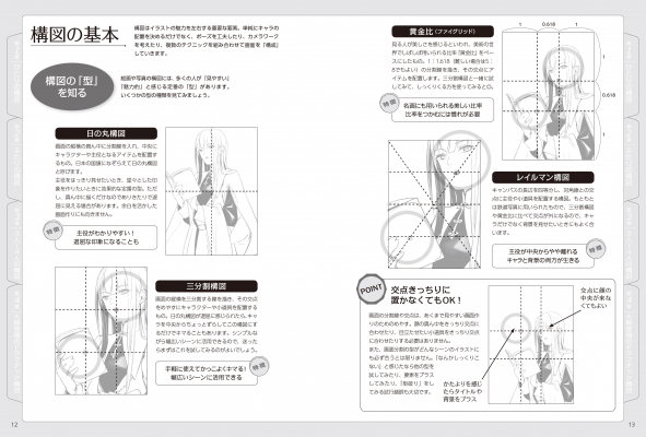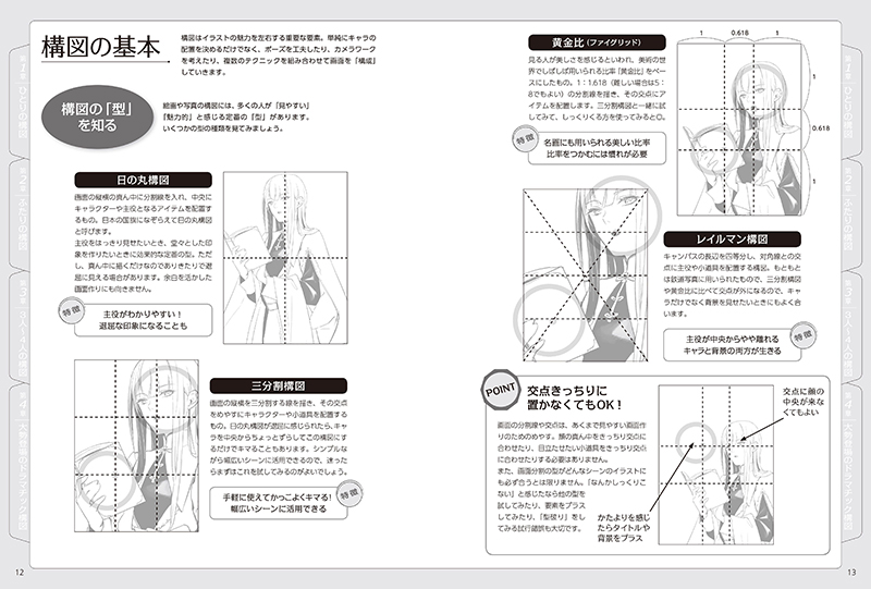 ひとりのキャラをかっこよく見せる構図はもちろん、恋人の関係性を表現する構図、大勢のキャラが集まったグループの構図なども掲載。一枚絵のイラスト、ポスター、同人誌の表紙などに幅広く活用できます。