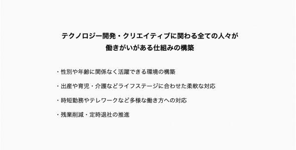 「技術革新を推し進め、テクノロジーの裾野を広げ、すべての人が豊かに暮らせる社会を目指す」、「テクノロジー開発・クリエイティブに関わる全ての人々が働きがいがある仕組みの構築」と2つの目標とそれに付帯するいくつかの目標を重点取組事項として定めつつ、最終的にはSDGsの17のゴールに向けて取り組んでまいります。