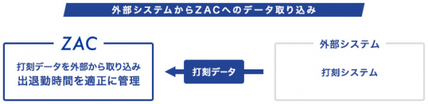 今回、今まで『ZAC』に備わっていたWeb上での打刻機能に追加して、外部の打刻機から出退勤データを取り込むことができるようになりました。今お使いの打刻機とのデータ連携が可能となるため、エクセル等でのデータ移行作業が不要となります。また、リアルタイムの打刻管理とデータ連携により、今まで以上に正確な時間外労働の見える化や、工数管理のさらなる精度向上が実現でき、企業や個人の生産性向上に対する意識改革も期待できます。