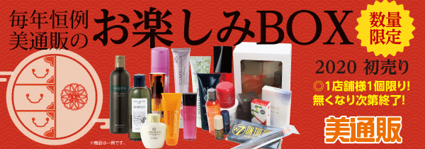「美通販のお楽しみBOX」は、人気のヘアケア・ヘアカラー・スタイリング・トリートメントなど・・・最大20,000円相当の美容商品が入った、たいへんお得な福箱です。2020年(令和2年)1月4日(土)より、順次発送予定となります。「新しい1年も頑張るサロン様を応援しサポートしていきたい」そんな思いを込めた、たいへんお得な新春セールですので、この機会に多くの方々にご利用いただければと考えております。