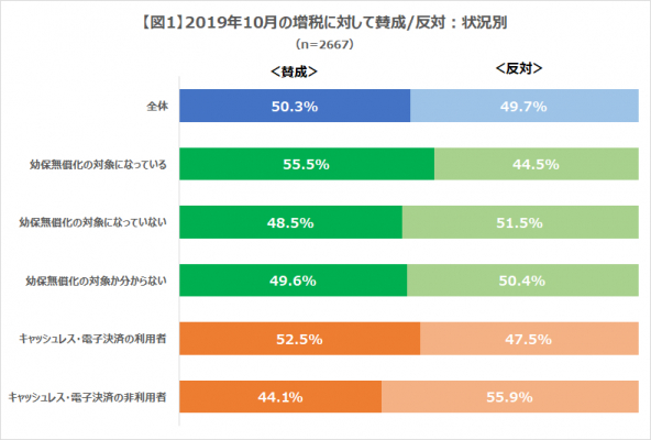 2019年10月に消費税が増税となったと同時に、「幼児教育・保育無償化」や「キャッシュレスのポイント還元策」など、子育て世帯にはメリットである制度も始まったことなども含め、増税について賛成か反対かをうかがいました。 全体では、賛成50.3%、反対49.7とほぼ同数という結果に(図1)。ただ、幼保無償化の対象者か非対象者か、キャッシュレスの利用者か非利用者かで見てみると、それらの恩恵を受けている人ほど「賛成」する人の割合が高くなりました。幼保無償化の対象者では「賛成」が55.5%、キャッシュレス・電子決済の利用者では「賛成」が52.5%。幼保無償化の対象かつキャッシュレス・電子決済の利用者に限ると、「賛成」の方は58.3%になります。