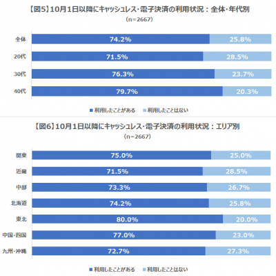 2020年6月30日まで「キャッシュレス・ポイント還元事業」として対象加盟店で利用すれば数%還元されます。そこで、10月1日以降にキャッシュレス・電子決済などを利用したことがあるかどうかを尋ねました。全体では「利用したことがある」が74.2%、「利用したことがない」が25.8%で、利用したことのある方が大多数でした(図5)。年代別に見てみると、年代が高いほど利用率が高い傾向にあります。また、年代が上がるにつれ利用頻度も上がる傾向にあります。また、エリア別に見てみると利用率が一番高いのは「東北」で80.0%となりました(図6)。