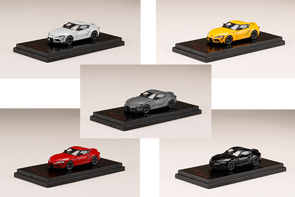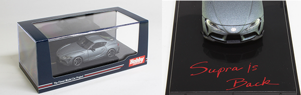 ボディーカラーはカタログカラーである「マットストームグレーメタリック」を含む全5色を同時発売します。ディテールにもこだわり、ヘッドライト内部の造形(ターンシグナルランプなど)やブレーキキャリパー、タイヤの溝に至るまで再現しました。ディスプレイに適したクリアケースとエモーショナルな字体で「Supra is Back」を印刷したディスプレイベースが付属しコレクションに適しています。