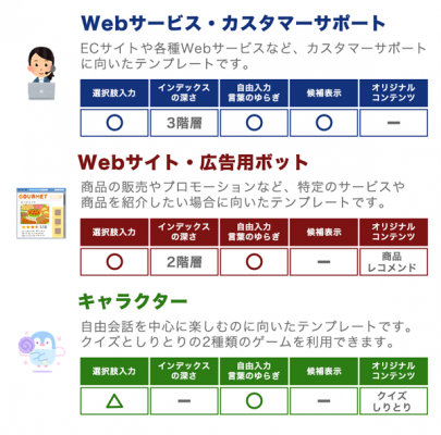 これにより、チャットボット導入効果などをスピーディーに且つ、簡単に確認して頂くことが可能となります。現在ご利用いただけるテンプレートは以下となります。(随時更新予定)