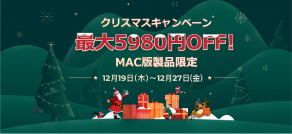 ワンダーシェアーソフトウェア社では、クリスマスキャンペーンを開催いたします。人気Mac版セットが最大5,980円OFF、そして人気Mac版単品の最大3220円OFFで12月19日から12月27日まで限定販売いたします。この機会をぜひお見逃しなく!