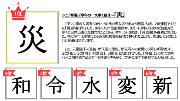 全国1都8県152拠点において、保健・医療・介護・保育・障がい者施設など福祉事業を展開する、社会福祉法人 聖隷福祉事業団(法人本部:静岡県浜松市/理事長:山本敏博/以下、聖隷)は、有料老人ホーム「エデンの園」の入居者を対象に、「今年の一文字」、「2019年の気になったニュース」の調査を実施し、227名に回答をしてもらいました。
