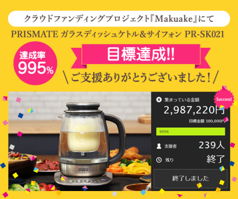 『PRISMATE(プリズメイト)ガラスディッシュケトル &サイフォン 楽しく使えるレシピブック付 PR-SK021 』のクラウドファンディングプロジェクトを行い、目標金額の995%の資金調達に成功しました。