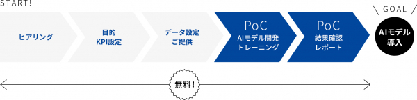 FirstPoCならご相談内容に応じて無料もしくは、お手ごろな料金にてAI導入が可能かどうか、PoC(概念実証)を行いご確認頂けます。もちろんその後、PoC結果を元にAIモデルの導入もご利用いただけます。