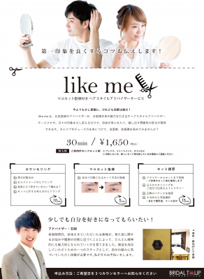 このような声を受けて開発したサービスが、元美容師が提供する眉カット指導付きヘアスタイルアドバイザーサービス「like me」です。婚活に役立つ「セルフプロデュース力」を、約30分の講習で身につけることができます。