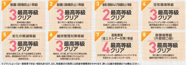 「クラージュ G-Classe」は、国の定める住宅性能表示制度で、構造の安定3項目、空気環境、劣化の軽減、維持管理、温熱環境、音環境など8つの最高等級を取得することができます。さらに、「全棟気密検査」「全棟UA値計算」により、平成28年省エネ基準を大幅にクリアする住宅であることを報告書の発行で証明します。さらに、長期優良住宅の基準となる耐震性、耐久性、維持管理、省エネルギー性等の条件を満たしており、加えて高い耐火性能によって省令準耐火にも標準で対応。火災保険料が大幅に安くなる等、安心と安全を備えた高性能住宅です。