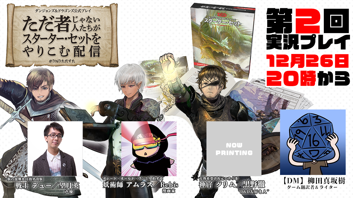 株式会社ホビージャパン(本社:東京都渋谷区、代表取締役社長:松下大介)は、同社が取り扱うTRPG『ダンジョンズ&ドラゴンズ』の「ただ者ではない」メンバーによる公式プレイ生放送の第2回を12月26日(木)20時からYoutube「TableGameChannel」にて配信致します。