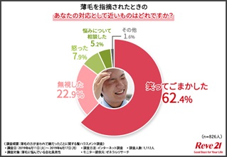 続いて、「薄毛を指摘されたときのあなたの対応として近いものはどれですか?」と聞いてみたところ、『笑ってごまかした(62.4%)』と回答した方の割合が最も多く、次いで『無視した(22.9%)』『怒った(7.9%%)』と続きました。