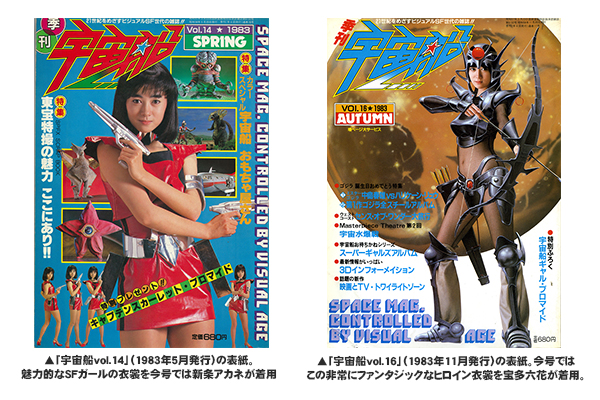 今回2人が着用するのは、「宇宙船」vol.14とvol.16(どちらも1983年発行)の表紙で、当時戦隊ヒロインを演じたばかりの女優・大川めぐみさんがモデルとして着用していた衣裳です。衣裳のデザインは現在まで「怪獣絵師」として活躍する開田裕治さん、衣裳製作は怪獣などの造形師として知られる若狭新一さんが担当しました。
