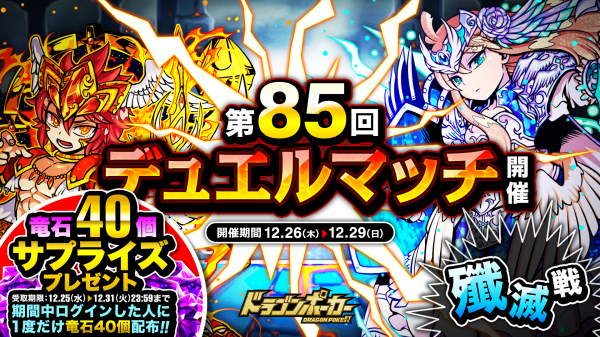 株式会社アソビズム(本社:東京都千代田区、代表取締役:大手智之)は、App Store・Google Playにて好評配信中のリアルタイム合体カードバトル『ドラゴンポーカー』で、2019年12月26日(木)より「第85回デュエルマッチ本戦」を開催いたします。