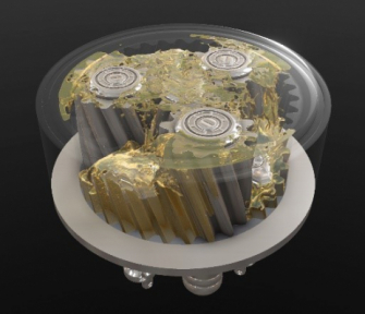 Particleworksによる遊星ギアのオイル攪拌解析結果(左)とCGレンダリング表示(右)