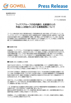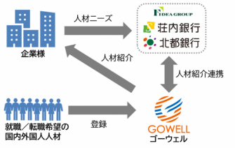 ゴーウェル株式会社(本社:東京都中央区、代表取締役社長:松田 秀和、以下「当社」という。)は、フィデアホールディングス株式会社(本社:宮城県仙台市、代表執行役社長:田尾 祐一)傘下の株式会社荘内銀行(本社:山形県鶴岡市、頭取:上野 雅史、以下「荘内銀行」という。)及び、株式会社北都銀行(本社:秋田県秋田市、頭取:伊藤 新、以下「北都銀行」という。)と外国人人材紹介事業における業務提携契約を2020年1月8日付で締結しましたので、お知らせします。