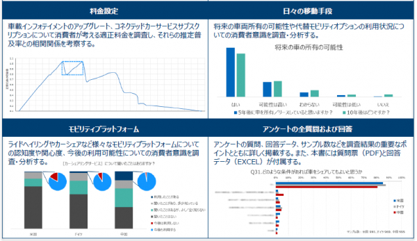 本書では、米国/ドイツ/中国の主要自動車市場を対象に、新たなモビリティスキームを含むコネクテッドカーの機能およびサービスの購入や利用に関する定量的な消費者意識調査を実施し消費者の意識や選好度および傾向を分析しています。