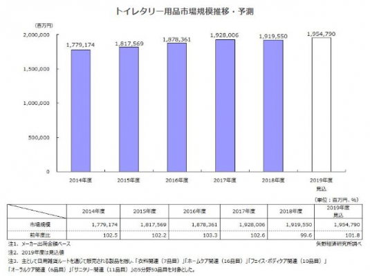 2018年度の国内トイレタリー市場規模(メーカー出荷金額ベース、5分野50品目)は、前年度比99.6%の1兆9,195億5,000万円となった。2018年度は、衣料用や台所用の洗剤や柔軟仕上剤などが詰替えタイプにシフトしたことによる単価下落、各社の価格競争激化の影響もあり、微減となったが市場は堅調に推移しており、2019年度の市場規模は同101.8%を見込む。