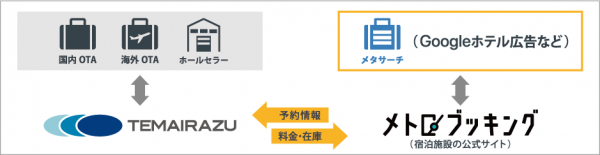 今回の連携により、宿泊施設は『メトロエンジン』 と TEMAIRAZUを併用することで、TEMAIRAZUから料金や在庫を自社サイトへ、予約情報を自社サイトからTEMAIRAZUへ連携することが可能となり、自社サイトと他の販売チャネルをTEMAIRAZUで一元管理することが可能となります。