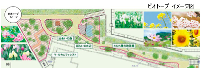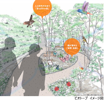 建替工事後もその環境を継続し、さらに周辺環境との調和を図り、訪れた鳥や虫たち、人々も安らげるような新しい緑地「ビオトープ」を計画しています。