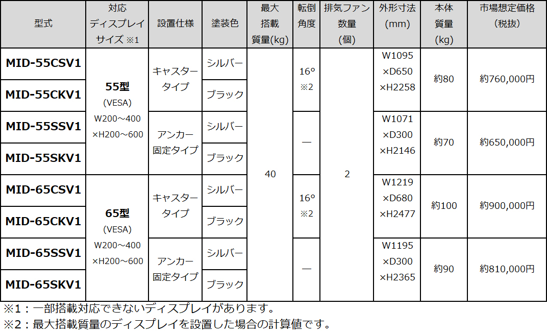 ■基本型式: MID-55(55型ディスプレイ対応)、MID-65(65型ディスプレイ対応)