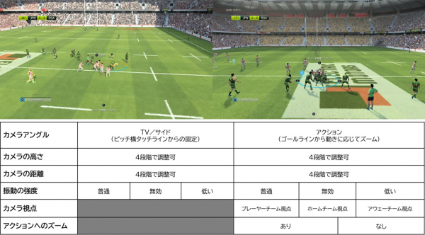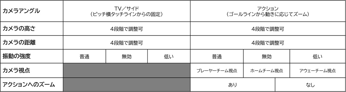 ・カメラオプションの追加:「オプションメニュー」でカメラの設定をカスタマイズできる機能が拡大。タッチライン側からの固定カメラ「TV/サイド」と、ゴールライン側からの稼働カメラ「アクション」から選択可能になり、ホーム/アウェー側など、好みに応じ視点変更が可能に。